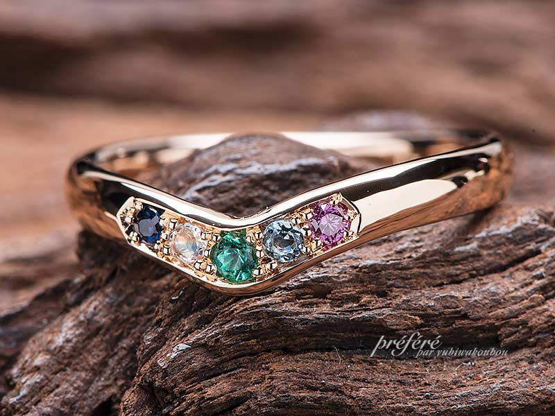 との想いを込めて、ピンキーリングにご家族皆様のお誕生石をお留めしました。