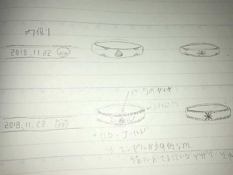 店舗では、お客様お一人お一人との会話の中でジュエリーに託す色々な想いやデザインを“カタチ“にしていくお手伝いをしております。