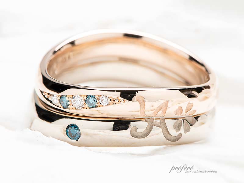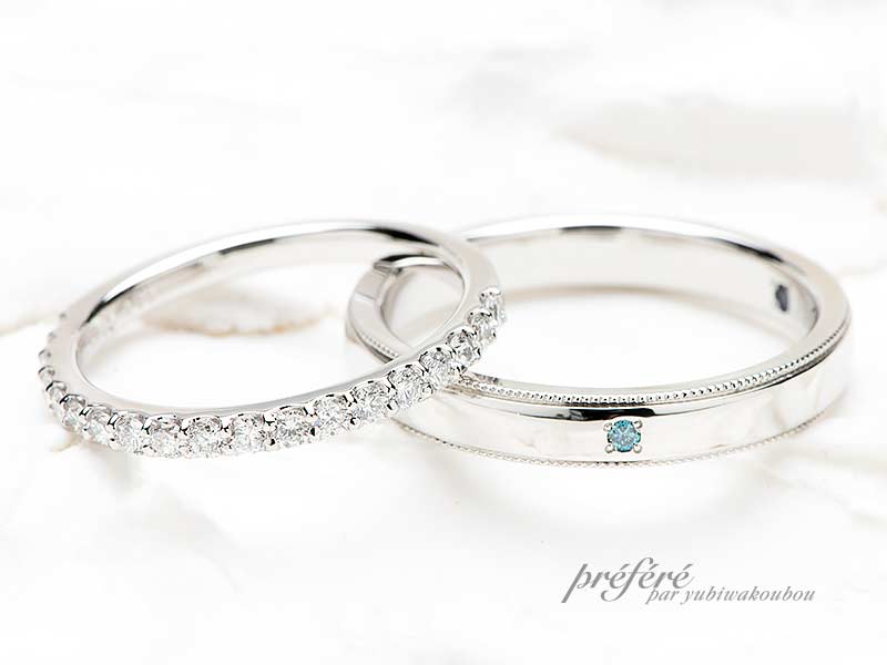 お互い気に入った指輪の形状や素材などが違ったとしても、ペア感を出すことはできます。例えば、リング内側に共通のモチーフを入れたり、表面に同じ色のダイヤモンドなどを入れたりと一目ではわからないようなさりげないペア感を出すことが可能です。